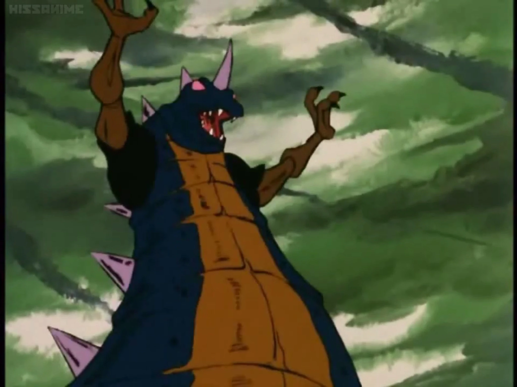 Ribo has a slim, dark green body with narrow arms. It has spinal spikes on it’s back and a horn on top of it’s head.